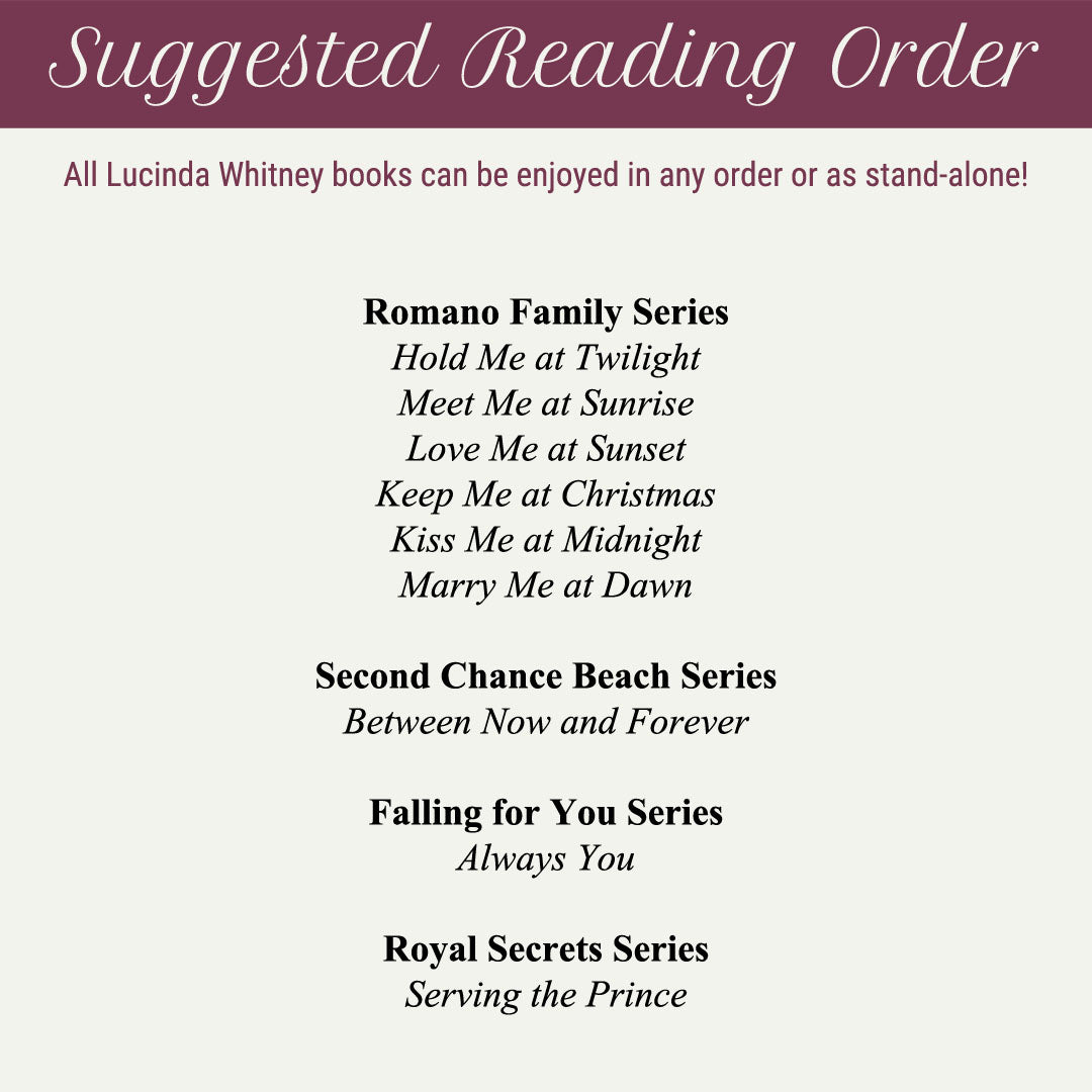 Get the entire Romano Family series by Lucinda Whitney. This sweet contemporary romcom series contains over 1,200 pages of reading!